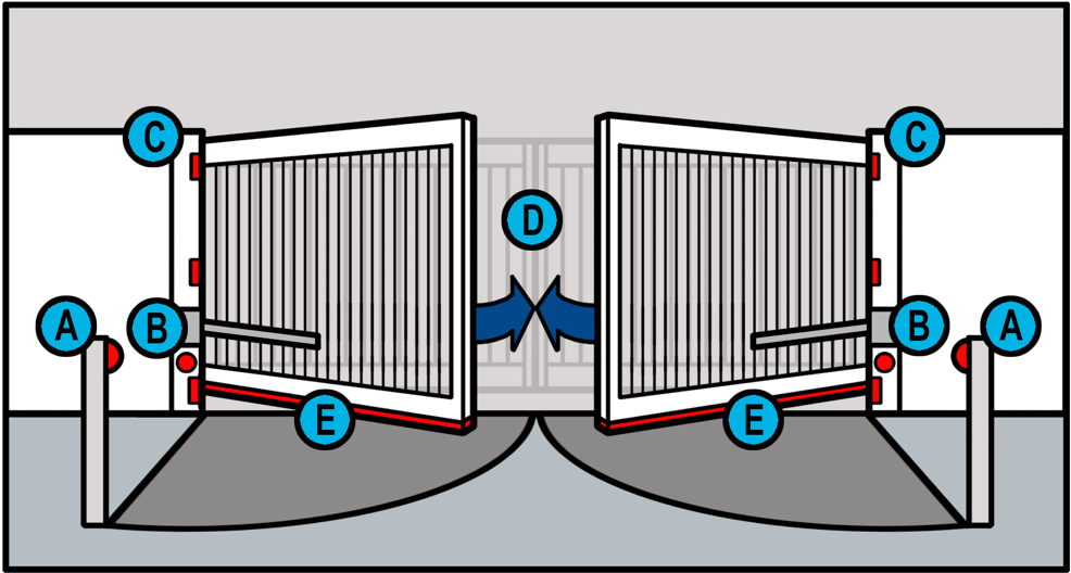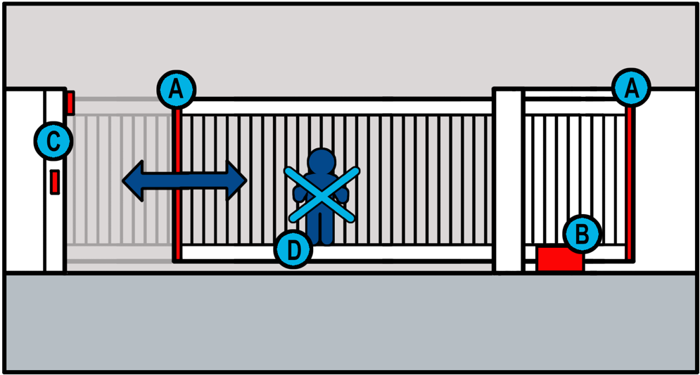 Een poortfabrikant is verantwoordelijk voor een veilige werking van een poort. De fabrikant is wettelijk verplicht om veiligheidscomponenten toe te passen zodat inklemming, beklemming en botsgevaar voorkomen wordt. Let bij de aanschaf van een poort op de aanwezigheid van de juiste veiligheidscomponenten. De tekening geeft een voorbeeld van de plaatsing van de veiligheidscomponenten.